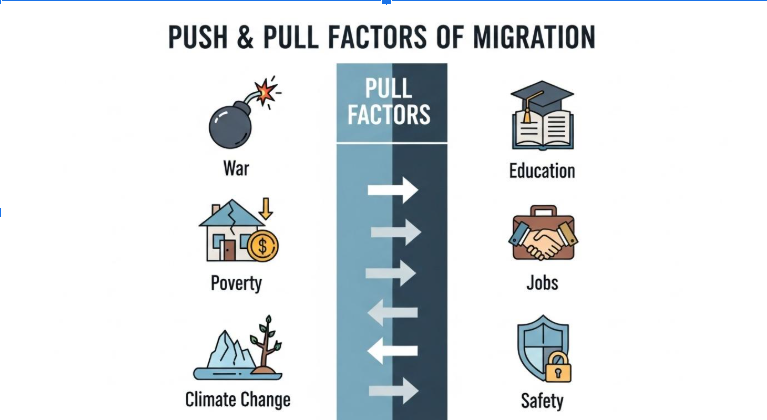 Behind every migration journey lies a powerful mix of “push” and “pull” factors, the forces that drive people to leave or attract them to new